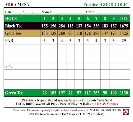 When Mira Mesa was originally opened to residents in 1993, it was the fourth executive golf course in The Villages. Totally renovated in 2011, Mira Mesa now features two par 4 holes and is a fun, challenging golf course that has a fair amount of contour to the land as it weaves through stands of oak and southern pine. The ninth hole is a tricky par 3 that takes you from an elevated tee box over a water feature to a narrow, well-guarded green. Par on this hole is an accomplishment – and a great way to finish a fun round of golf. Depending on your preferences regarding tee position, Mira Mesa can play as short as 1130 yards and as long as 1675 yards. This is a terrifically fun course and one you don’t want to miss as you explore The Villages Executive Golf Trail.