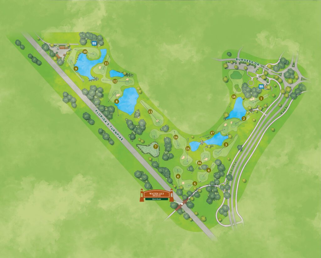 Winding through beautiful oak trees and with the Water Lily Bridge as the background, Richmond Pitch & Putt is a golf car-free course, designed to be an enjoyable round of golf for the beginner while testing the short game of the experienced player. The Richmond Pitch & Putt is located just northeast of the Water Lily Golf Car Bridge off of Meggison Road, across from Lake Okahumpka Recreation Center.