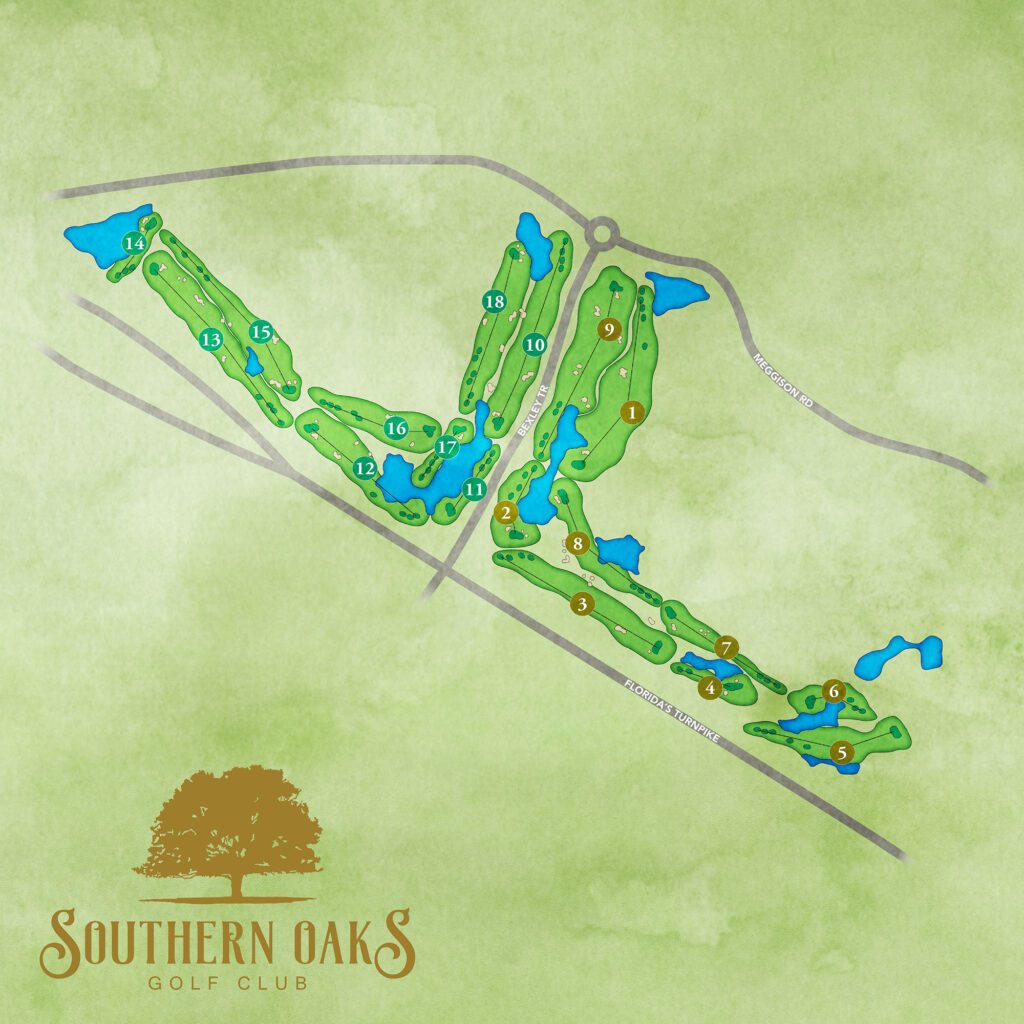 Designed by The Villages’ longtime golf course architect Kenny Ezell, Southern Oaks Golf Club is unique with three Par 3’s, three par 4’s and three par 5’s on each of the nines. Each of the par 3’s, 4’s and 5’s plays in different directions, giving you a unique and fun experience on each and every hole. Five sets of tees ranging from 6500 yards from the Gold tees down to 4000 yards from our Friendly Tees offer an exceptional, playable golf course no matter the ability level.