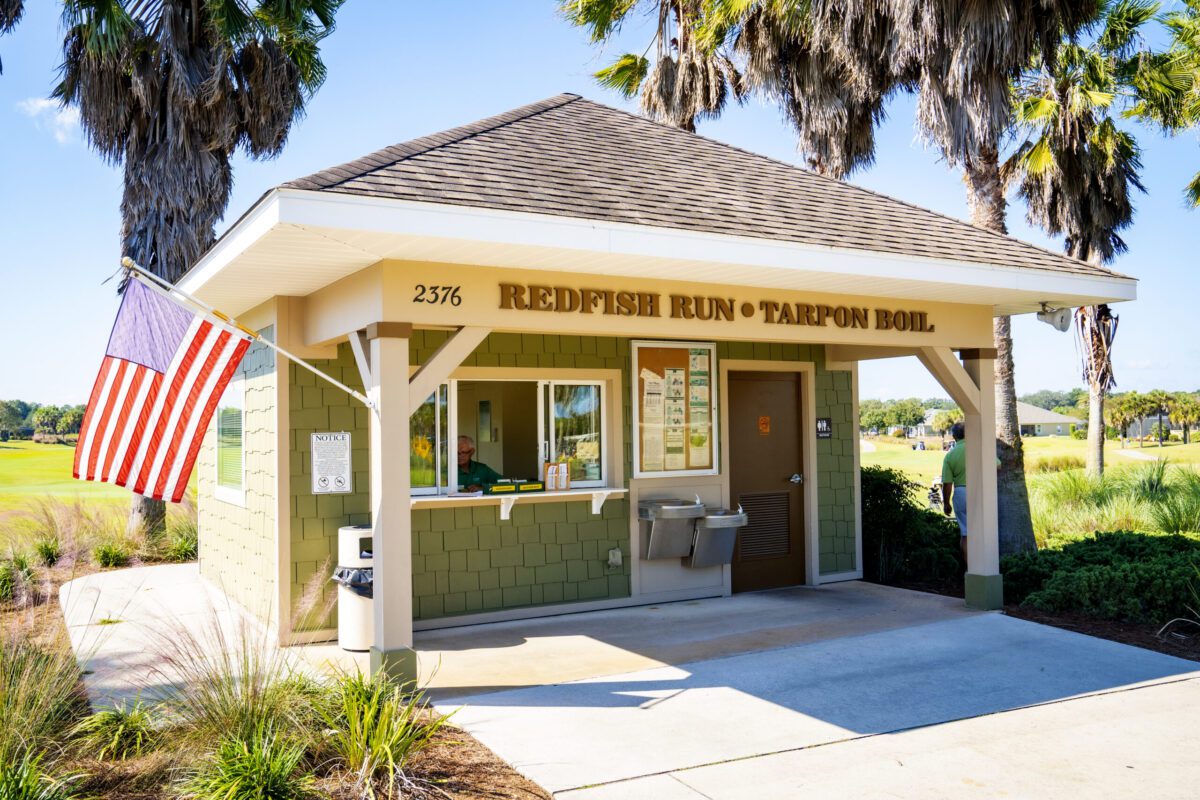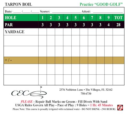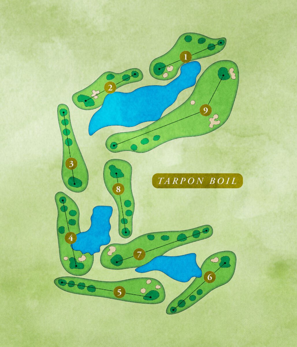 Tarpon Boil is about variety. With multiple tee locations to choose from, this course offers the golfer an opportunity to use all of the clubs in the bag. The first eight holes play as par 3’s and prepare the golfer for the big finish for the par 4 ninth hole. This golf course is beautifully designed, complimented with a variety of landscapes. Naturalized areas filled with native cord grasses are seen throughout the round and come in to play on most of the holes. These naturalized areas promote water conservation and are essentially maintenance free. The “signature hole” is the ninth a perfect way to finish the round with a dog-leg left par 4 that flows nicely along the water’s edge. A good tee shot on the last hole will set you up for a fantastic finish for a birdie!