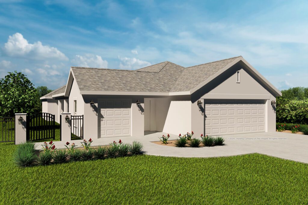 Introducing the Tranquility floor plan, from the Garden Villa series, featuring 3 bedrooms, 2 bathrooms, 2-car garage plus golf car garage and separate driveway for your golf car. Your front entry welcome reveals a light and bright great room with panoramic views of your private side lanai and courtyard. Beautiful large open island kitchen with windows highlight spacious vaulted ceilings, full-height cabinetry and modern finishes. The primary suite features walk-in shower, closet, and double vanity. Guest rooms are perfectly designed for visitors expanding your space – one with a walk-in closet. Experience the best of Florida living in your enclosed courtyard.