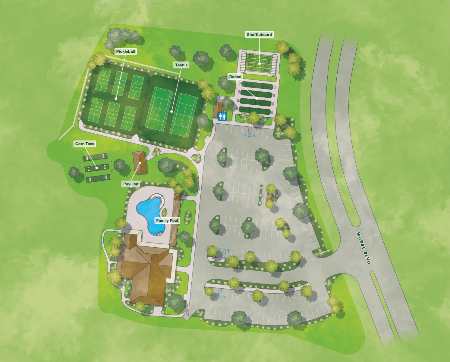 With an abundance of bird life surrounding the neighboring eagle preserve, visitors to Aviary Recreation can enjoy Florida wildlife at its best. Intricate details abound as you’ll notice bird holes notched high above the exterior entrance paired with thoughtful consideration inside representing many beautiful aspects of Florida bird life. While playing your favorite card game or meeting with a social club, look up and take notice of the birds nestled among the artfully crafted twig chandeliers. Just outside, residents can enjoy a resort-style family pool or head out to the dual-purpose courts for a game of pickleball or tennis.