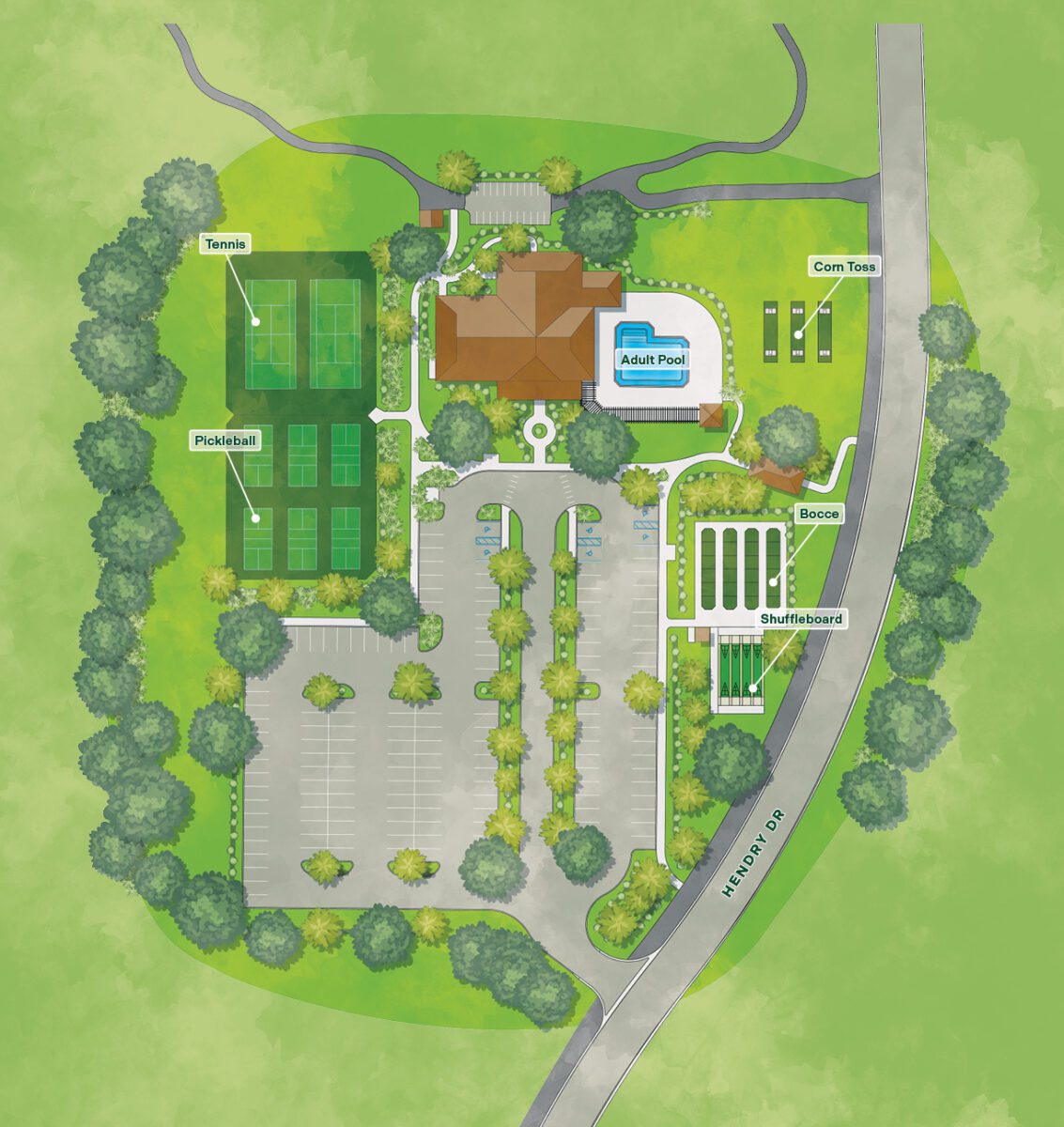 A bright and cheerful color palette paired with floral accents welcome you with southern charm. Villagers can enjoy their favorite indoor recreation activities in southern floral named rooms such as the Periwinkle, Goldenrod, or Plumeria. Outdoors, neighbors and friends can be seen gathering at the picnic pavilion for a social event or relaxing at the family pool where golf views surround.
