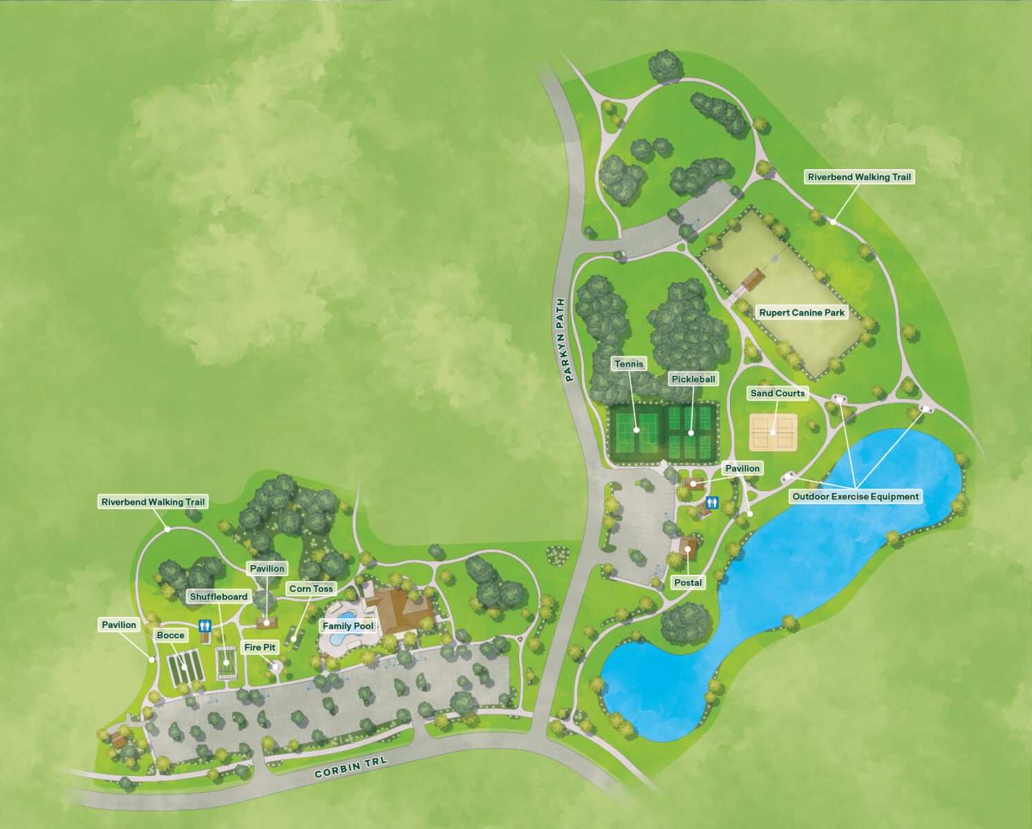 At Riverbend Recreation, there’s something for everyone—even your four-legged friends! Follow along the winding river rock path that leads you to gathering rooms named after some of Florida’s historic rivers. Here visitors can find themselves striking up a game of billiards or meeting with their favorite social clubs. Outside, Villagers can take part in a game of volleyball or beach tennis on the dual-purpose sand courts or play with their furry friends at Rupert Canine Park. The popular zero-entry resort-style family pool is a great way to relax and round out your day here.