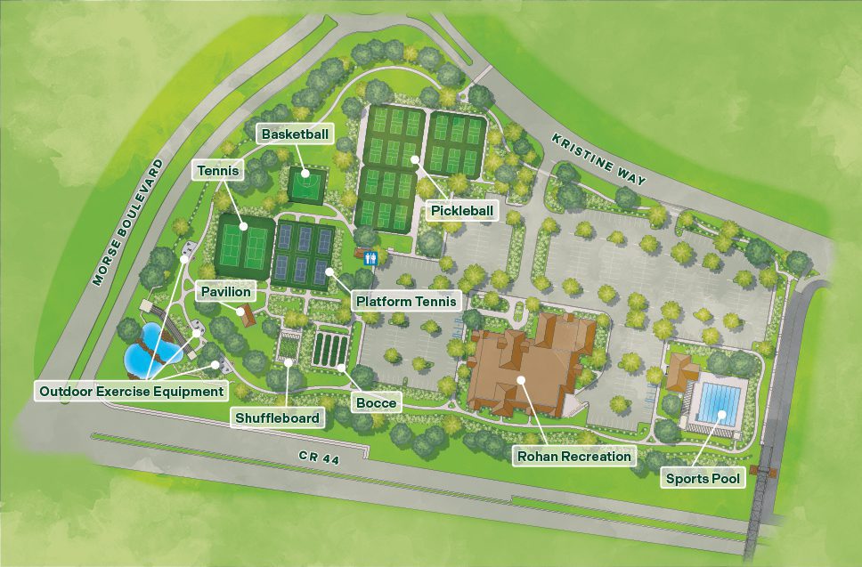 Historical events and memorabilia capture the story of how The Villages has grown and come to be known as Florida's Friendliest Hometown. Named after longtime Executive Director of Recreation & Parks, John Rohan, opportunities to pursue an active and healthy lifestyle are plentiful. Residents can enjoy tapping into their creative sides alongside friends in the Mulberry Grove arts and crafts room, or stepping out onto the courts for a game of pickleball or tennis, where spectator seating is also provided. Unique to this location are the neighboring Soaring Eagle Softball Fields and Air Gunnery Range where residents can pursue even more recreation activities.