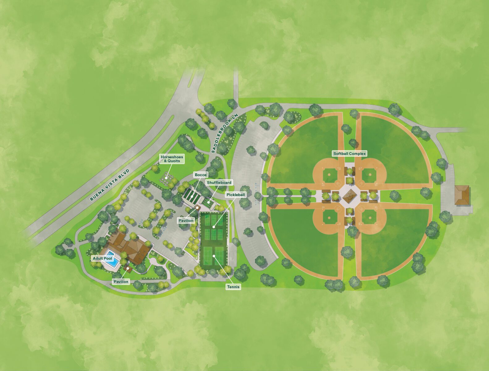 Inspired by the neighboring Villages Polo Club, you’ll find a rich color palette of paisley and plaids welcoming you to pursue favorite hobbies and pastimes alongside friends. Gathering rooms large and small give a glimpse inside the game of polo in The Villages where you’ll see Villagers participating in a variety of activities such as social club meetings, exercise classes, or a game of billiards. Round out your day here with a game of softball at the Saddlebrook Softball Complex, or relax by the family pool with the tree lined golf course views.