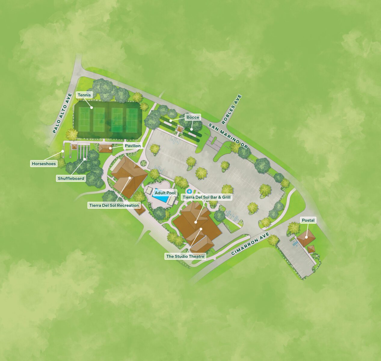 Warm south of the border hues invite you to gather with a favorite social club, enjoy a game of table shuffleboard, or learn something new in one of the Southwestern inspired gathering rooms. Residents enjoy their time outdoors playing a game of tennis or meeting with friends for time well spent at the picnic pavilion. Round out your day here relaxing at the adult pool or take in a show at the intimate black box Studio Theatre nearby.