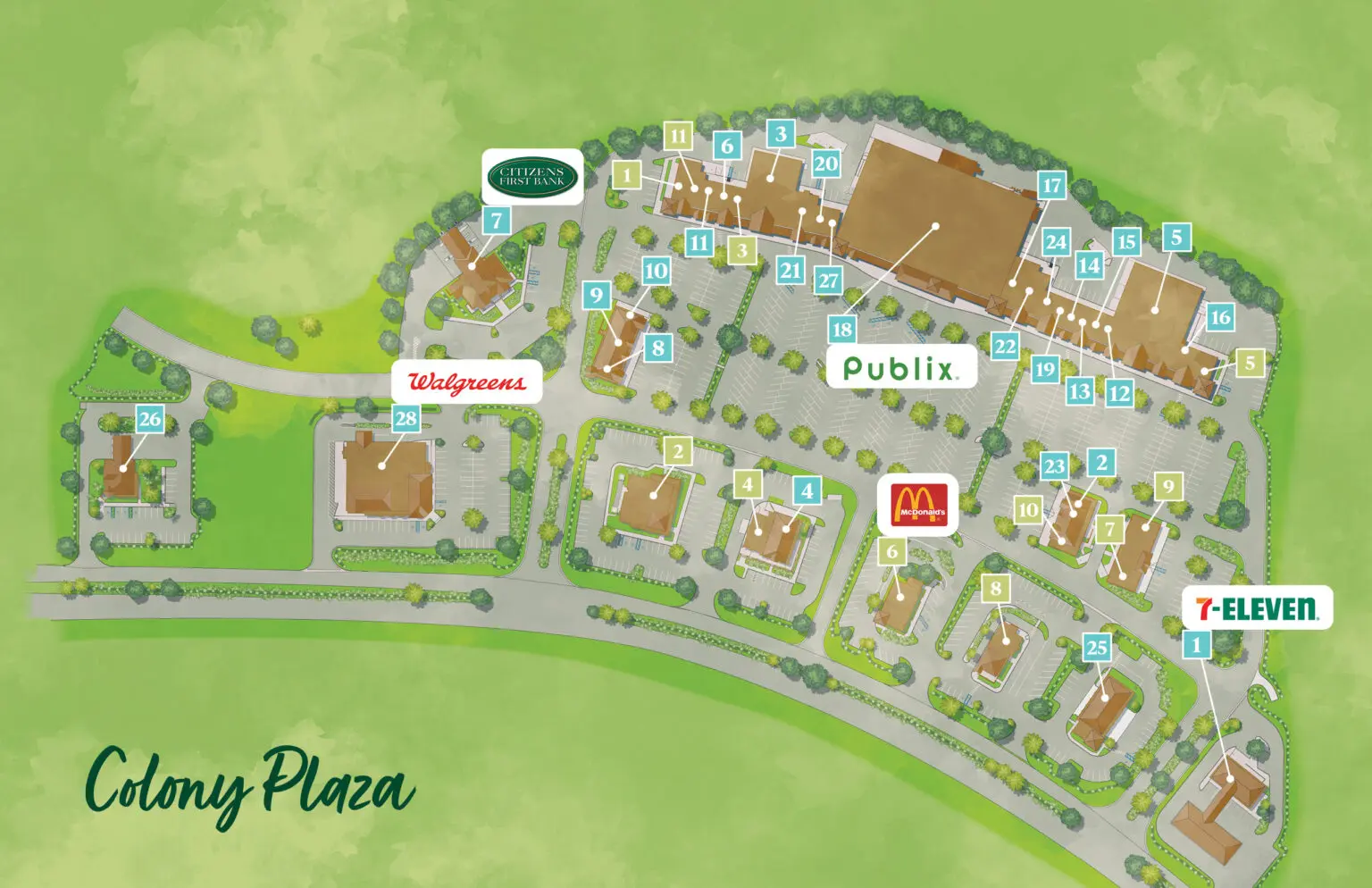 Featuring an array of retail including health and beauty, clothing and accessories, automotive and groceries. You’ll find just what you need at Publix Super Market, Beall’s Outlet, Walgreen’s and many more including a variety of dining options to round out your day here.
