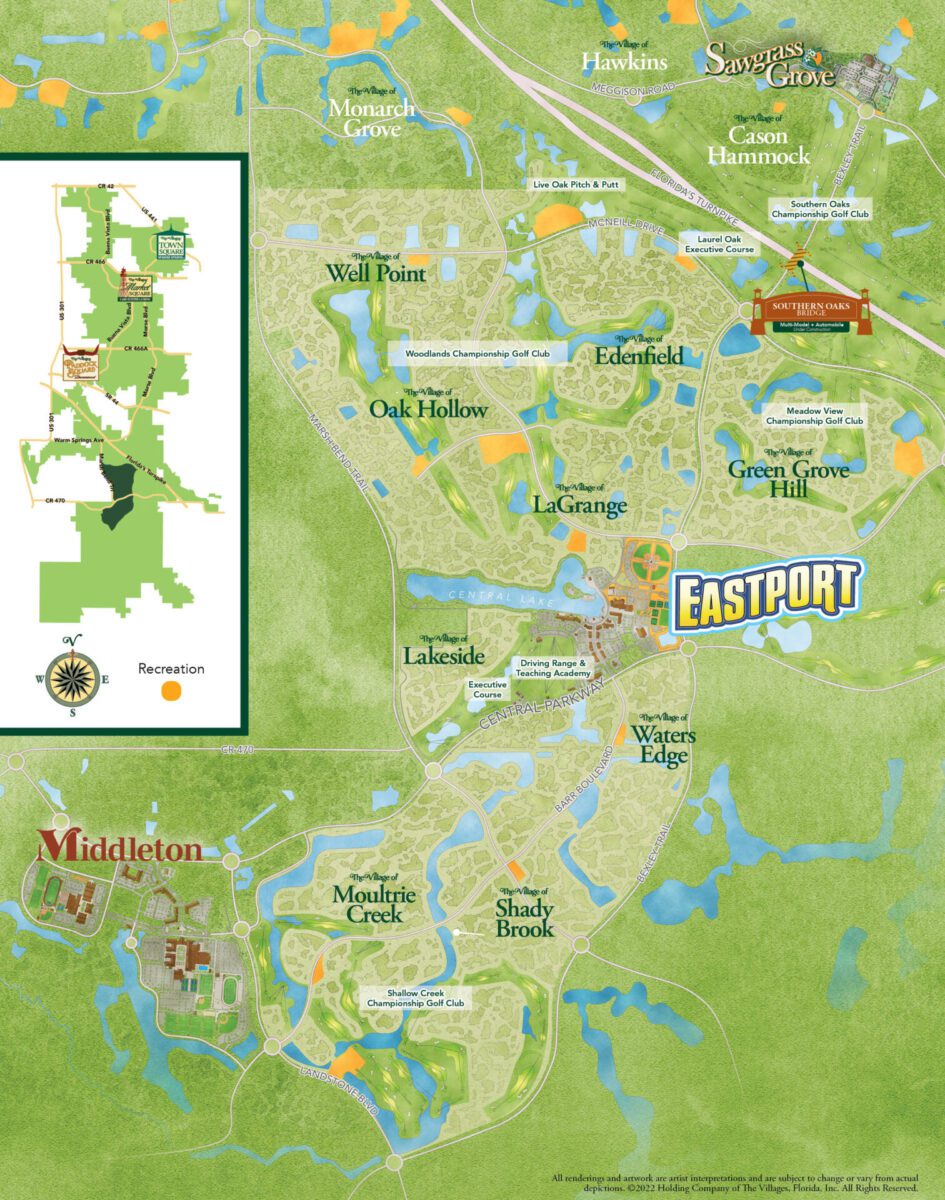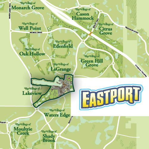 Eastport is located between the future Southern Oaks Bridge and the recently renamed Country Road 470, Central Parkway. And while still in the early stages, we know this will become a popular destination for Villagers, their friends and family.