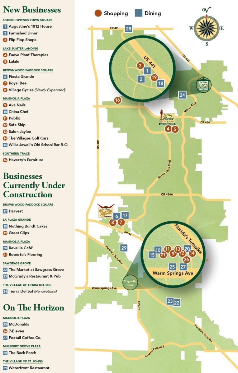 From north to south and places in between, nationally known and locally owned, there are shopping and dining treasures around every corner – opening in all areas of The Villages. This month join Harper Boone as he takes us on a journey through some of the many businesses that have opened, are under construction, or are on the horizon for you to enjoy.