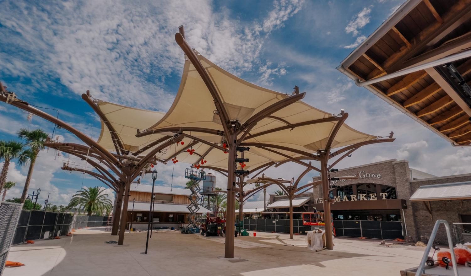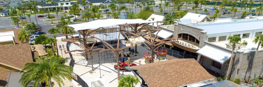Another milestone has been reached as the team stretched the canopy covers over the outdoor entertainment area at Sawgrass Grove. The outdoor entertainment area and bar will host a variety of live music performances, which is sure to be a popular gathering spot where Villagers, neighbors and friends can get together for a great time.