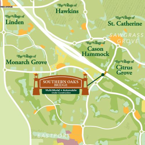 The Southern Oaks Bridge is located just south of the Sawgrass Grove area, running along Bexley Trail between the two Southern Oaks Championship Golf nines. This bridge will accommodate automobiles as well as golf cars and take folks from the areas just north to the new Villages, Eastport and south – expanding the connectivity of our community.