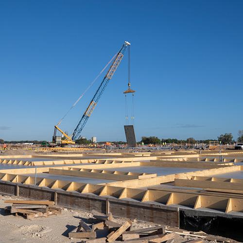 In this edition of Continuing the Dream, we visit the construction sites for the high school and K-8 schools in Middleton to watch the first buildings go up at The Villages Charter School campus. Part of an approximately 12-week process, it takes a team of skilled folks to do the heavy lifting, with mammoth 180-ton cranes and equipment that symbolize something big is taking place – literally. In all, 532 tilt walls will be assembled on site for the high school alone!