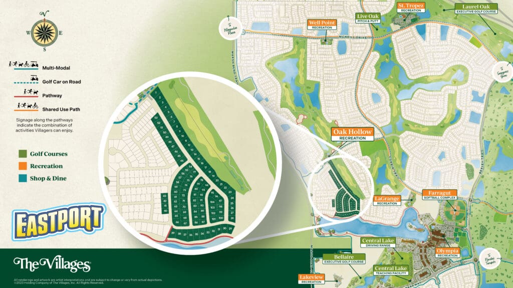 Located just moments to Eastport and connected to a wide variety of recreation, shopping, dining, and entertainment, The Village of Oak Hollow offers an array of possibilities. Tee up some fun at the nearby 18-hole Live Oak Pitch and Putt, spend a day at the beautiful Shallow Creek or Woodlands Championship (coming soon) Golf Clubs, or soak in some quality time with the grandkids at any of the surrounding resort-style family pools— and with Olympia Recreation just down the golf car path, there’s even more exciting ways to pursue an active and connected lifestyle.