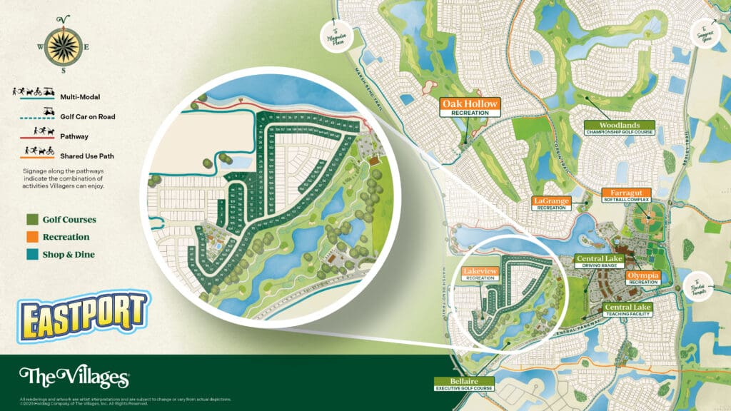 Just steps from the vibrant Eastport Town Center, The Village of Lakeview offers a prime location to live near and experience The Villages lifestyle. Tee off at Woodlands Championship or Bellaire Executive golf courses, refine your swing at the Central Lake Golf Academy and Driving Range, or connect with neighbors at Lakeview Recreation Area’s adult pool and outdoor gathering spaces. Just beyond your doorstep, enjoy all the fun and recreation at the Olympia Recreation Complex, complete with a sports pool, softball complex, rock climbing wall and more. Explore the waterfront pathways that wind through Eastport, seamlessly connecting recreation, shopping, dining, health and wellness, and entertainment—all close to home.