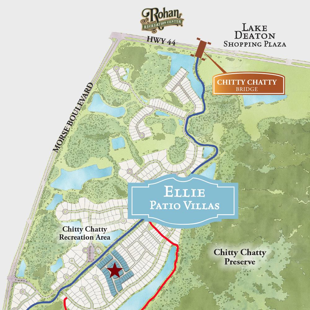 Debuting in this neighborhood are 5 ALL NEW Patio Villa floor plans that appeal to those looking to live big in small spaces. Ellie Patio Villas are located just moments away from Chitty Chatty Recreation Area and adjacent to the paths and trails that get you to Lake Deaton Shopping Plaza and Rohan Regional Recreation Complex.