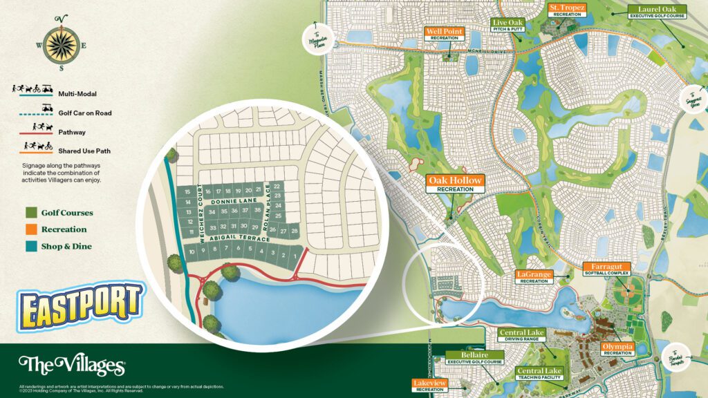 The Village of Oak Hollow offers a perfect balance of relaxation and connection—just a short golf car ride to Eastport, where recreation, shopping, dining, and entertainment come together.