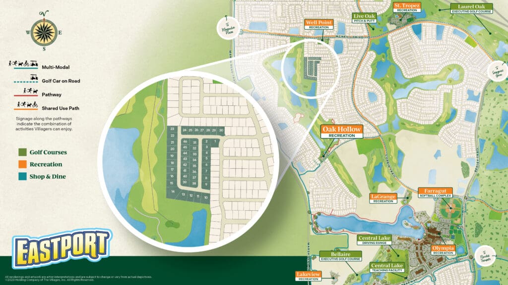 Experience the lifestyle residents enjoy every day in The Village of Well Point—where simplicity, style, and convenience come together in a welcoming and vibrant community. Just a short golf car ride to everything Eastport has to offer, you’ll enjoy seamless access to some of the very best of The Villages lifestyle. Whether it’s soaking up the sun at nearby adult or family pools, a friendly game of pickleball or outdoor sports at Well Point Recreation, quality time at the St. Tropez family pool and game room, or dining and live music at Sawgrass Grove, every day brings new opportunities to create lasting memories. With a variety of Executive, Championship, and Pitch & Putt golf courses nearby—and peaceful strolls by Central Lake just moments away— Well Point is the perfect place to call home!