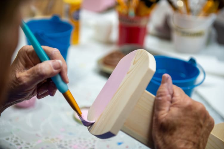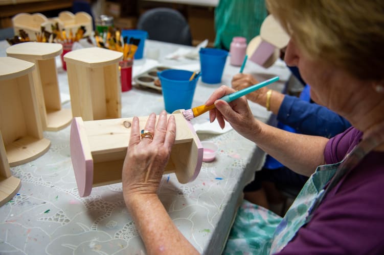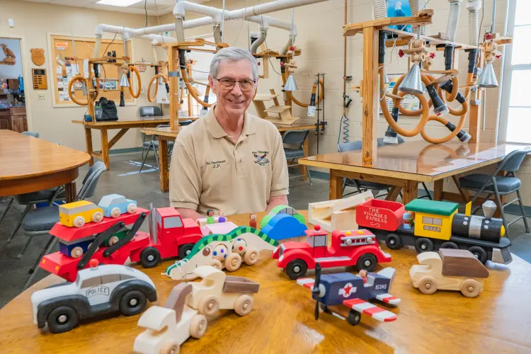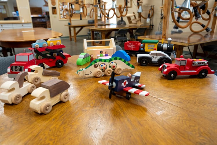 The Woodworker’s Club is a community of Villagers with big hearts. Each year, members handcraft and paint thousands of toys, from cars to toolboxes, for local children. They create toys year-round for organizations that support kids. With over 30 toy designs, these volunteers transform raw lumber into treasures that bring smiles and joy.