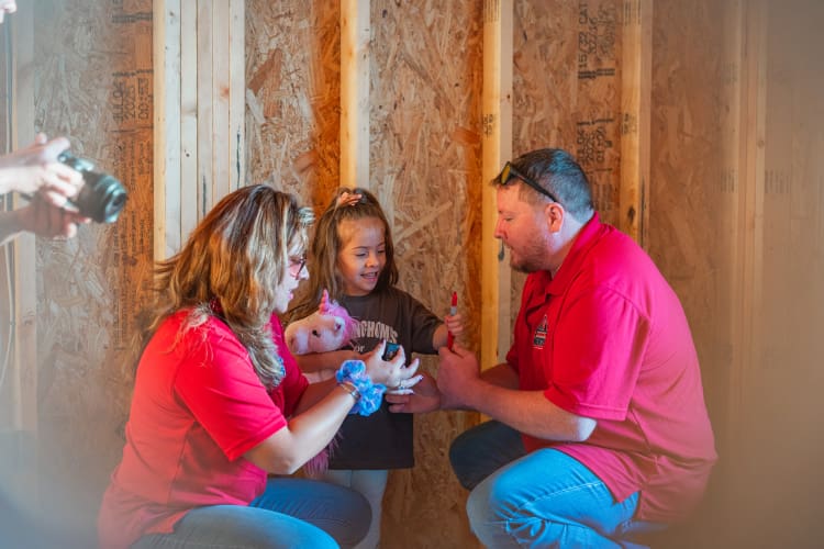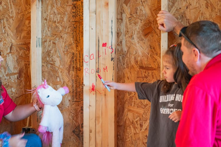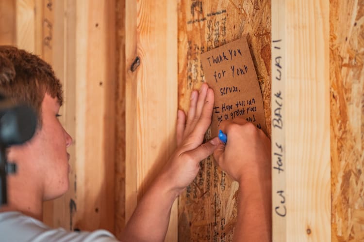 Notes of Love is a unique and heartfelt tradition central to every Building Homes for Heroes project. Before the final finishing touches are applied, friends, family, students, and community members gather to write personal messages of appreciation, encouragement, and hope directly onto the walls and structural beams of the home. The notes, ranging from heartfelt thank-yous and scribbled masterpieces by children, to profound messages of support transform a construction site into a home of gratitude. While the notes may eventually be covered by drywall and paint, the impact they leave is lasting. Veterans and their families walk through rooms lined with this lasting legacy of love, knowing their new mortgage-free home is built on a foundation of heartfelt community support. This ceremony serves as a powerful reminder that they are surrounded by a community that honors their service and sacrifices.